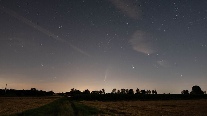 Alle 5 000 bis 7 000 Jahre kommt der Komet Neowise der Erde so nah, dass er mit bloßem Auge zu sehen ist – wie derzeit. »Zu finden ist er eigentlich ganz leicht. Man schaut vom großen Wagen aus schräg nach rechts unten, und dort knapp über dem Horizont sieht man den Kometen dahin schweben. Ein wirklich spannendes Schauspiel«, beschreibt GEA-Leserin Julia Schellig, der diese Aufnahme geglückt ist. Am 23. Juli steht der Komet der Erde am nächsten. Dann beträgt seine Entfernung nur noch 103 Millionen Kilometer. Derzeit erscheint der Komet nachts am nordnordöstlichen Sternenhimmel, ab dem 18. Juli ist er nur noch abends zu sehen.
