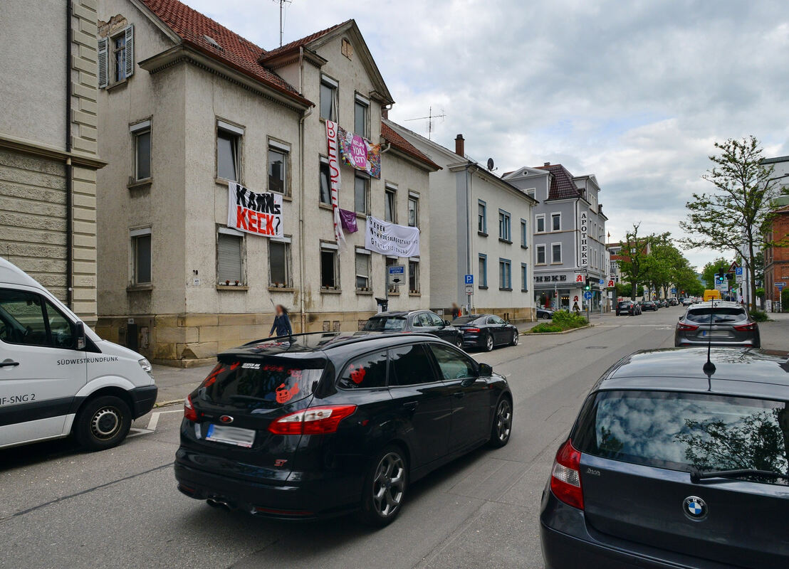 Sichtbare Zeichen gegen Wohnungsnot: die Transparente in der Kaiserstraße 39. FOTO: NIETHAMMER