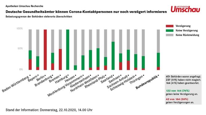 Bei einer Umfrage der Apotheken Umschau gaben 42 von 164 Behörden an, es gebe aktuell Verzögerungen, beziehungsweise einen Stau, bei noch zu informierenden Kontaktpersonen der Kategorie I. Das sind Menschen, die sich für 14 Tage in Quarantäne begeben müssten, deren Gesundheit täglich überwacht werden sollte und die im Einzelfall auch auf eine Infektion mit Sars-CoV-2 getestet werden sollten. Um Infektionsketten zu unterbrechen und die Pandemie einzudämmen, ist es besonders wichtig, diese Menschen zu ermitteln. Besonders überfordert sind die Ämter in Berlin, 100 Prozent der Befragten gaben Verzögerungen an.