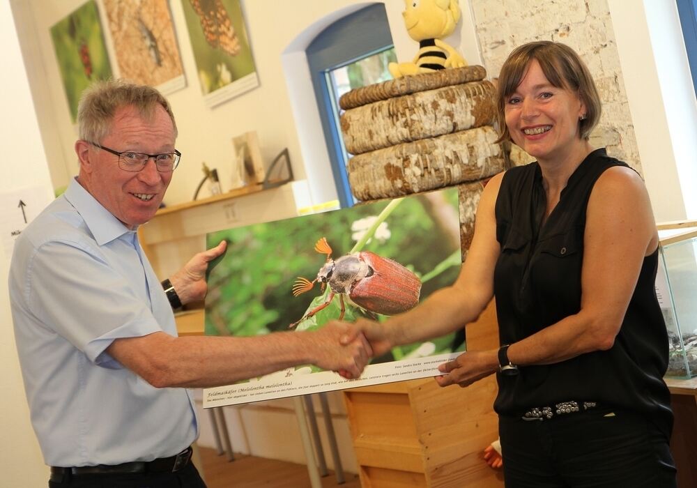 Helmut Treutlein freut sich über den Zuwachs im Krabbeltierhaus. Symbolisch für 37 weitere Krabbel-Motive überreicht ihm die Pfullinger Naturfotografin Sandra Starke einen Feldmaikäfer.
