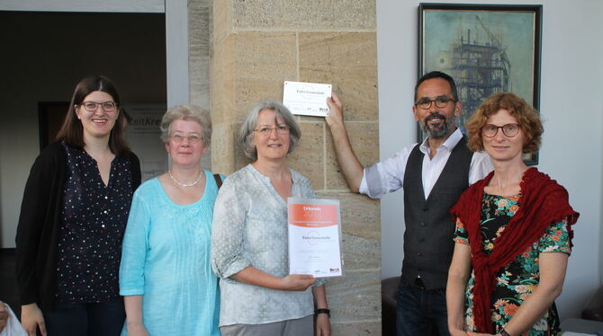 Miriam Knecht (Diakonisches Werk), die Kirchengemeinderätinnen (von links) Ute Kaptein, Gabi Bürkle und Gabi Zwissler-Schmid und Pfarrer Stephan Sigloch freuen sich. FOTO: KIRCHE