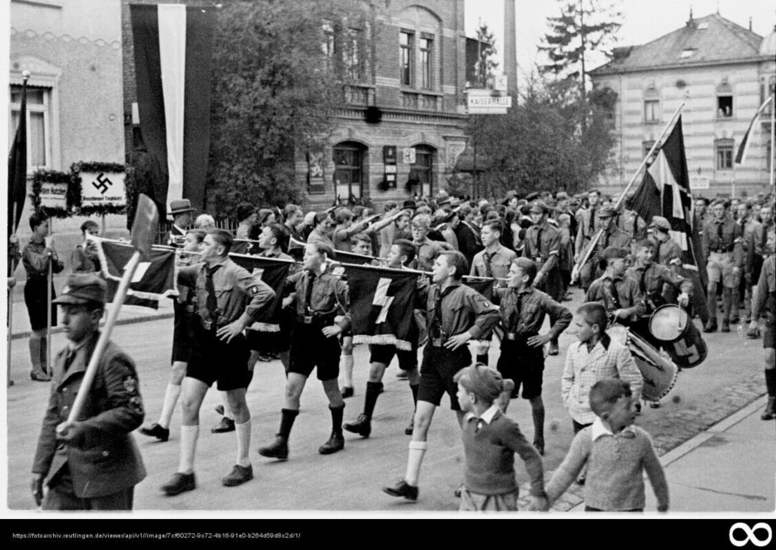 Maifeier im Jahr 1935: Der Fanfarenzug der »Pimpfe« beim Umzug in der Kaiserstraße.