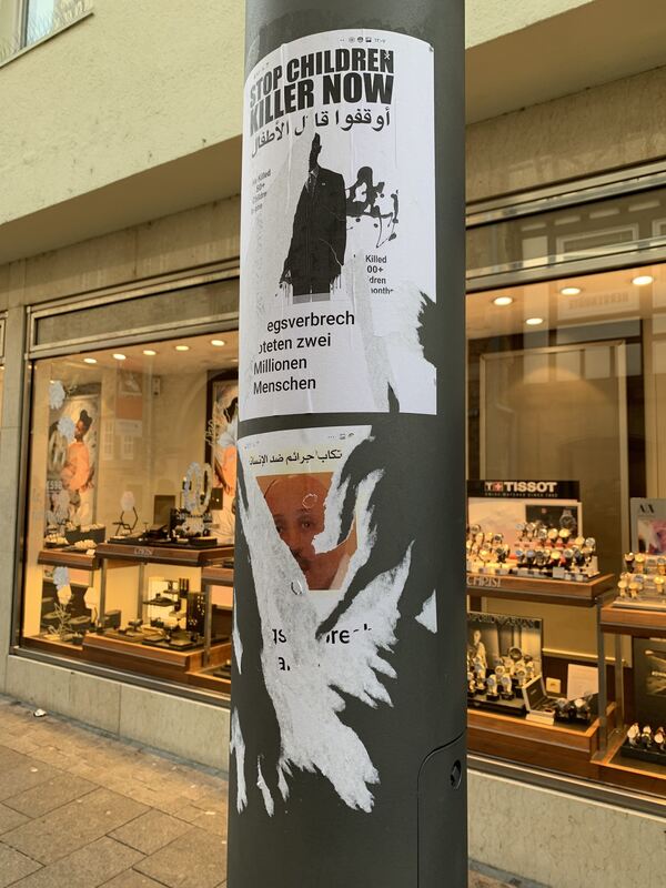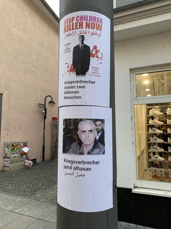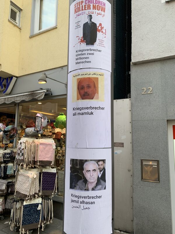 Drei Personen sind auf den Plakaten zu sehen. Einer von ihnen ist Baschar al-Assad, der syrische Präsident. Er soll 50 Kinder an einem Tag getötet haben, mehr als 1100 in 14 Monaten, steht in englischer Sprache auf dem Papier. Zwei Syrer, die durch die Innenstadt flanieren, halten an und werfen einen Blick auf die Fotos. Den Präsidenten erkennen sie sofort, die anderen beiden Namen, Ali Mamluk und Jamil Hassan, haben sie noch nie gehört, sagen sie.