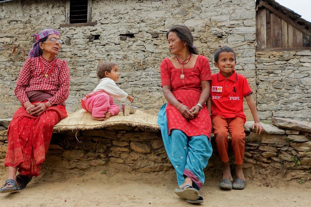 Ein Foto aus besseren Zeiten: Diese Frauen und Kinder leben heute, genau wie alle anderen Bewohner des nepalesischen Dorfs Ramshe, im Freien unter Plastikplanen. Auch das Haus im Hintergrund ist heute unbewohnbar. FOTO: PR