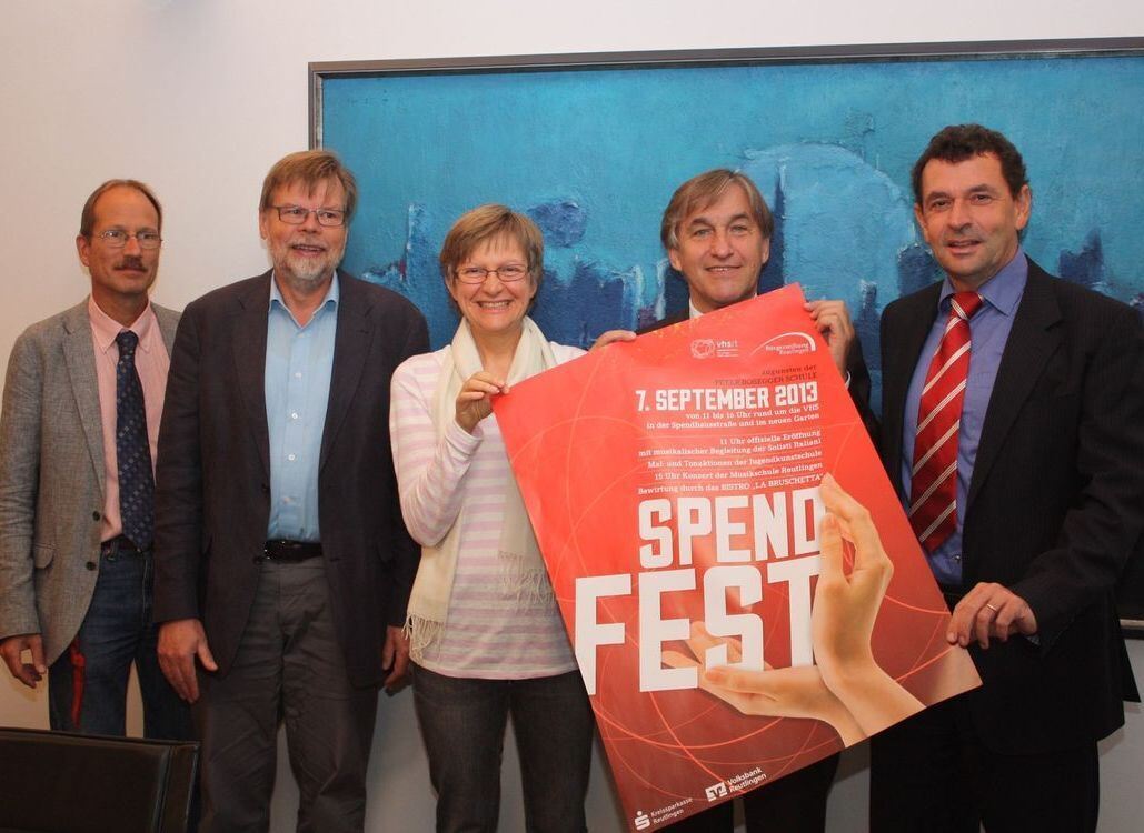 Jugendkunstschulleiter Thomas Becker (Bild links, von links), Joachim Kalk, Rektor der Peter-Rosegger-Schule, Musikschulleiterin Karin Hurle, Bürgerstiftungs-Vorsitzender Karl-Heinz Walter und VHS-Geschäftsführer Dr. Ulrich Bausch wollen dem »Spend-Fest« zum Erfolg verhelfen. FOTO: STRÖHLE