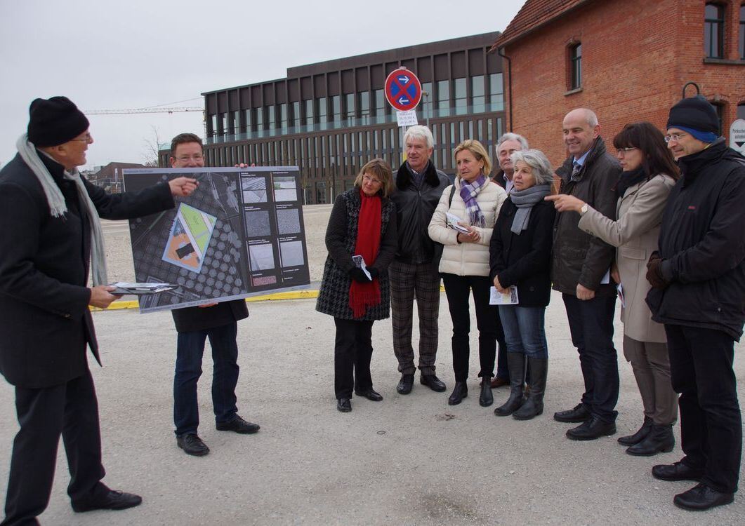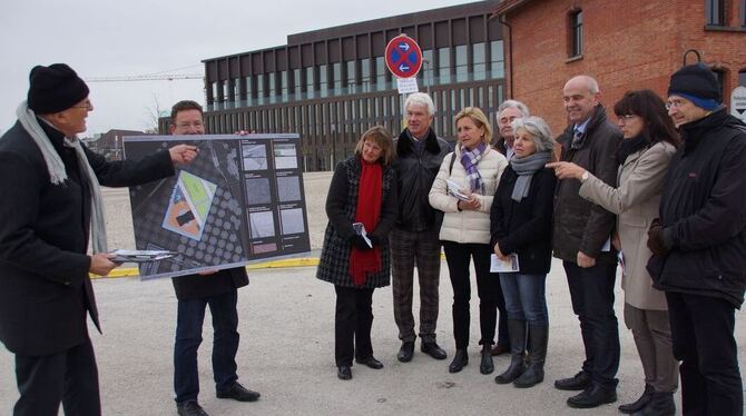 Hans Kienle (links) vom Planungsbüro erläutert den Gemeinderäten die Gestaltung des Kulturplatzes an Ort und Stelle. FOTO: REY