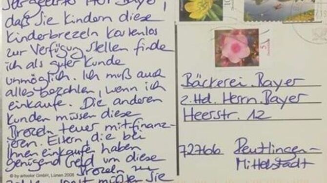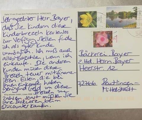 Unter den rund 160 Kommentaren findet sich kein einziger, der die Meinung des Postkartenschreibers teilt. Stattdessen hagelt es Häme und Spott. »An den guten Kunden: Wenn es dir zu teuer ist, dann kannst ja du zum Discounter«, schreibt einer. Ein anderer kommentiert: »Vielleicht sollte man dem Kartenverfasser eine Kinderbrezel anbieten, da dieses Verhalten, die Karte anonym zu versenden, einfach nur kindisch ist. Vom Inhalt mal ganz zu schweigen.«