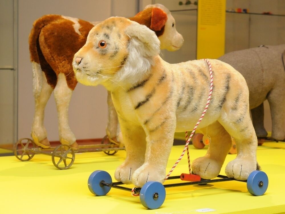 Plüschtiere wie dieser kleine Tiger und die Kuh im Hintergrund sind bis zum 9. Februar im zweiten Obergeschoss des Heimatmuseums zu sehen.