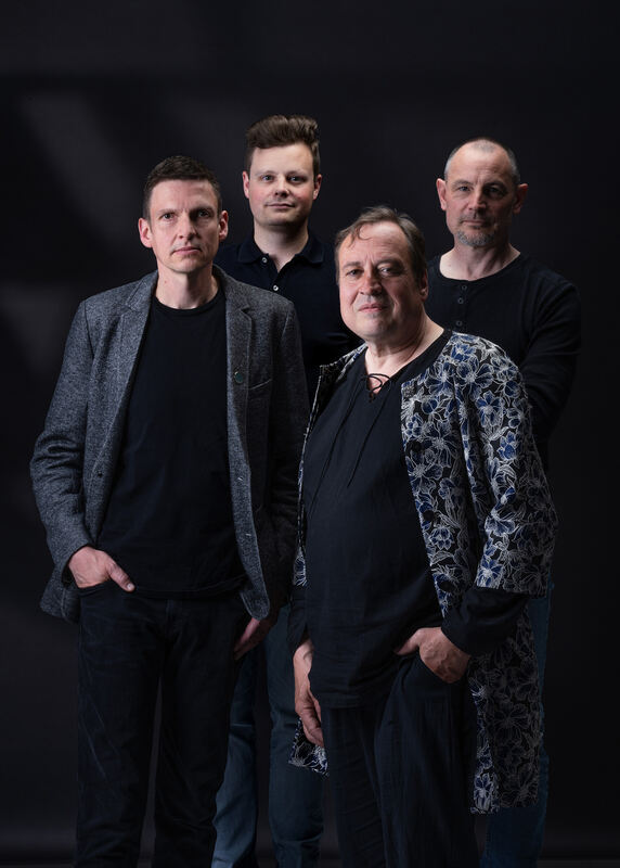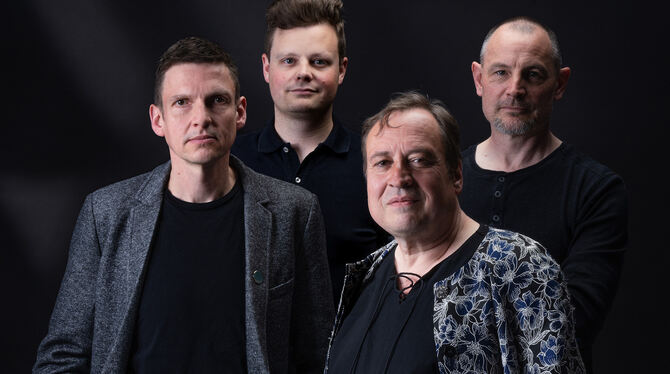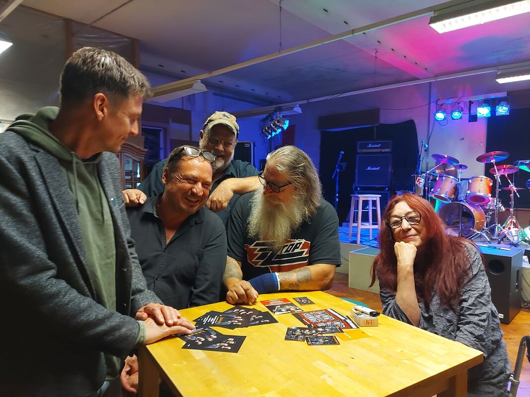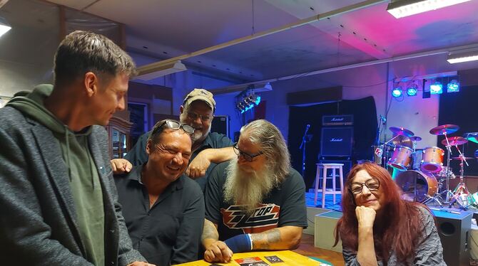 Vorfreude auf »Lammba Zamba« (von links): Haage-Gitarrist Christoph Fricker , Bernhard Haage, Nils Hemme Hemmen , Armin »Luser« Martis und seine Frau Bea, die Kneipenwirtin, im Proberaum, der zum Konzertsaal werden soll.
