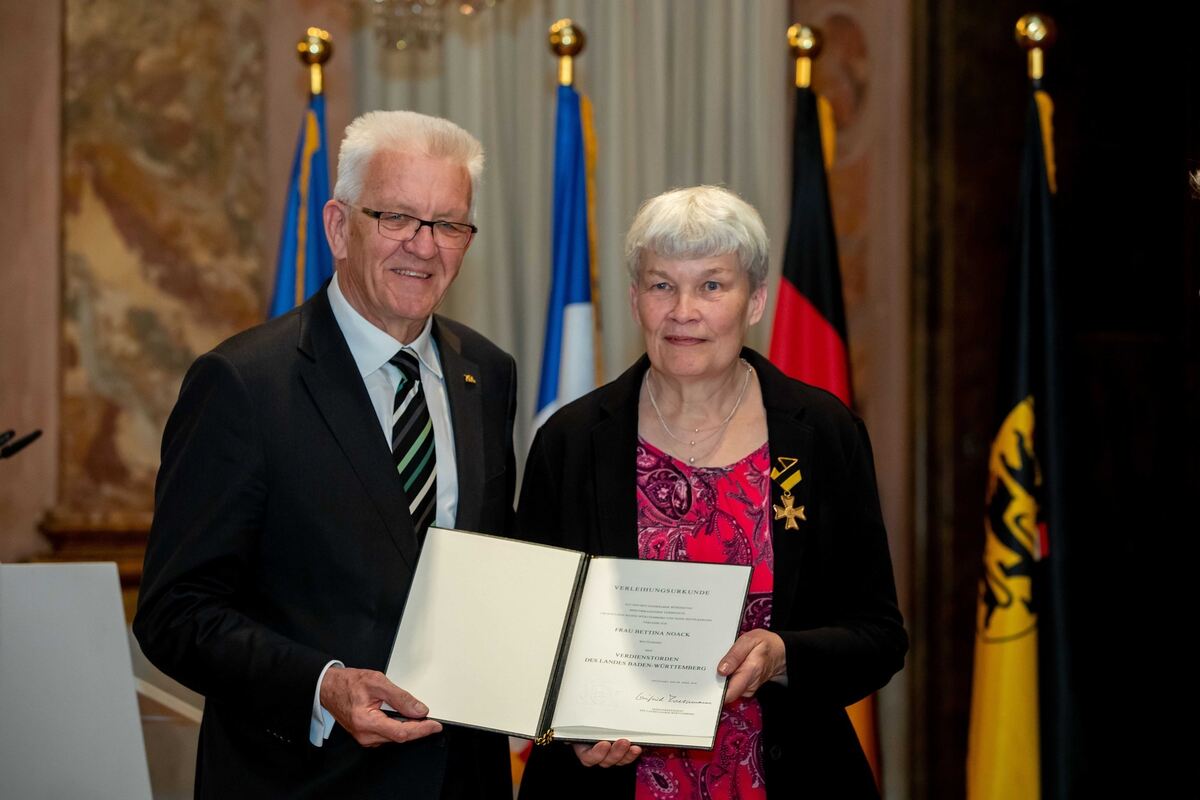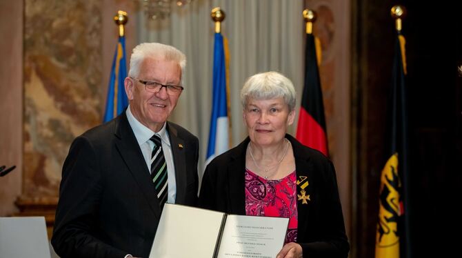 Baden-Württembergs Ministerpräsident Winfried Kretschmann hat Bettina Noack aus Reutlingen den Landesverdienstorden verliehen. FOTO: STAATSMINISTERIUM