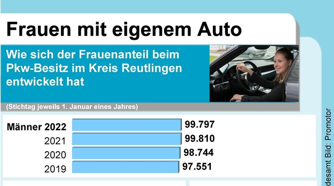Aktuell gilt für den Kreis Reutlingen: Männliche Halter haben 99.797 der Pkw entsprechend 54,6 Prozent (Vorjahr: 54,8 Prozent). Auf Firmen waren 19.369 beziehungsweise 10,6 Prozent (10,5) der Autos zugelassen und auf Frauen 63.660 oder 34,8 Prozent (34,7).