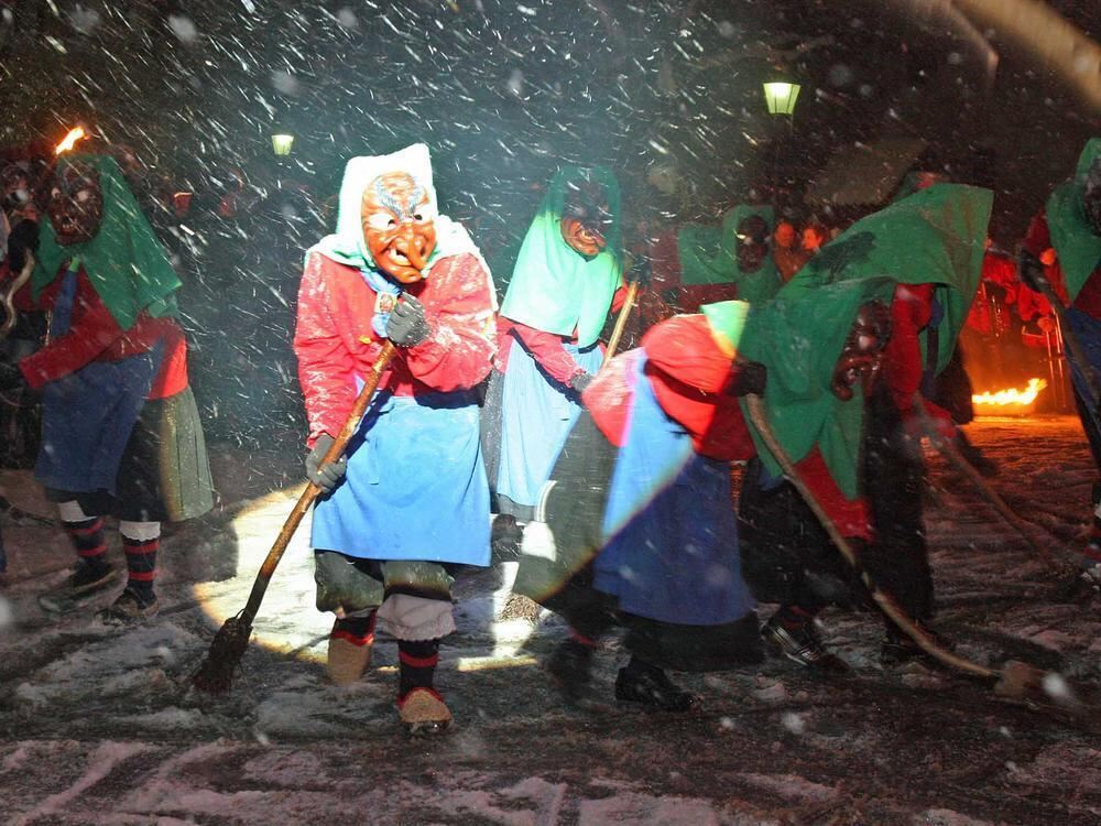 Wilsinger Hexen mit krummen Nasen und krummen Besen begleiten im Schneetreiben die nächtliche Fasnetsverbrennung.