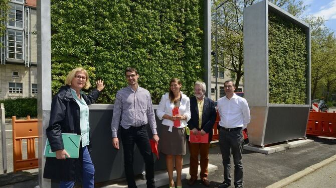 REUTLINGEN. »Den ersten Freilandversuch weltweit«, nennt es Victor Splittgerber vom Start-Up-Unternehmen »Green City Solutions« aus Dresden. Denn die entwickelten Pflanzenwände zur Verbesserung der Luft, genannt »City Trees«, stehen in dieser Form nur in Reutlingen. Mitten auf der Lederstraße, der Problemzone Reutlingens in Sachen Stickstoffdioxidwerte, sind die beiden vier Meter hohen, bepflanzten Wände nun im Einsatz.