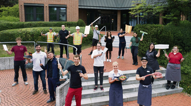 Die Ausrüstung steht schon parat: Egal ob Fleischermesser, Hackbeil, Hammer oder Kamm – ausgerüstet für ihren Job, erzählen 14 Auszubildende und zwei Meister über ihren Arbeitsalltag. Zum Gruppenbild trafen sie sich vor der Handwerkskammer Reutlingen.