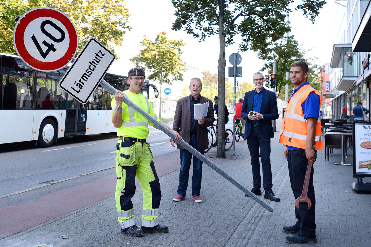 Jetzt gilt's: Gestern installierten Sascha Gärtner (links) und Jens Böttcher (rechts) von den Technischen Betriebsdiensten die Tempo-40-Schilder, begleitet von Gerhard Lude (Zweiter von links), Leiter der Verkehrsabteilung, und Ordnungsamtschef Albert Keppler. FOTO: PIETH