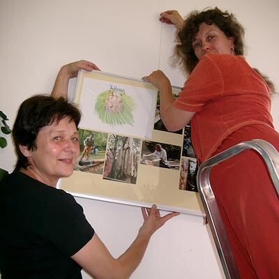 Johanna Schneider (oben) und Lucy Gocht hängen die Bilder für die Foto-Ausstellung »Ein Baumhaus entsteht« gemeinsam auf.