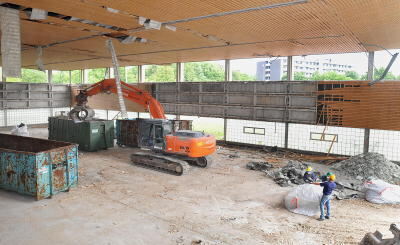 Kraftvoll, aber feinfühlig: Facharbeiter nehmen mit schwerem Gerät die Carl-Diem-Halle »sortenrein« auseinander. Bis Ende Juni sollen sie damit fertig sein.