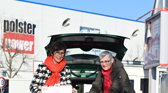 Die Lions-Damen Monika Bläsius (links) und Gerda Eschmann nach dem Einkauf beim Discounter für den Tafelladen. Das könnte jeder tun, der helfen möchte. FOTOS: ZENKE