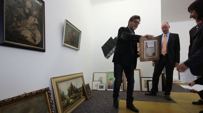 Galerist Wilfried Thron und Lionsclub-Präsident Markus Nawroth (rechts) bei der Begutachtung der Werke. FOTO: BERNKLAU