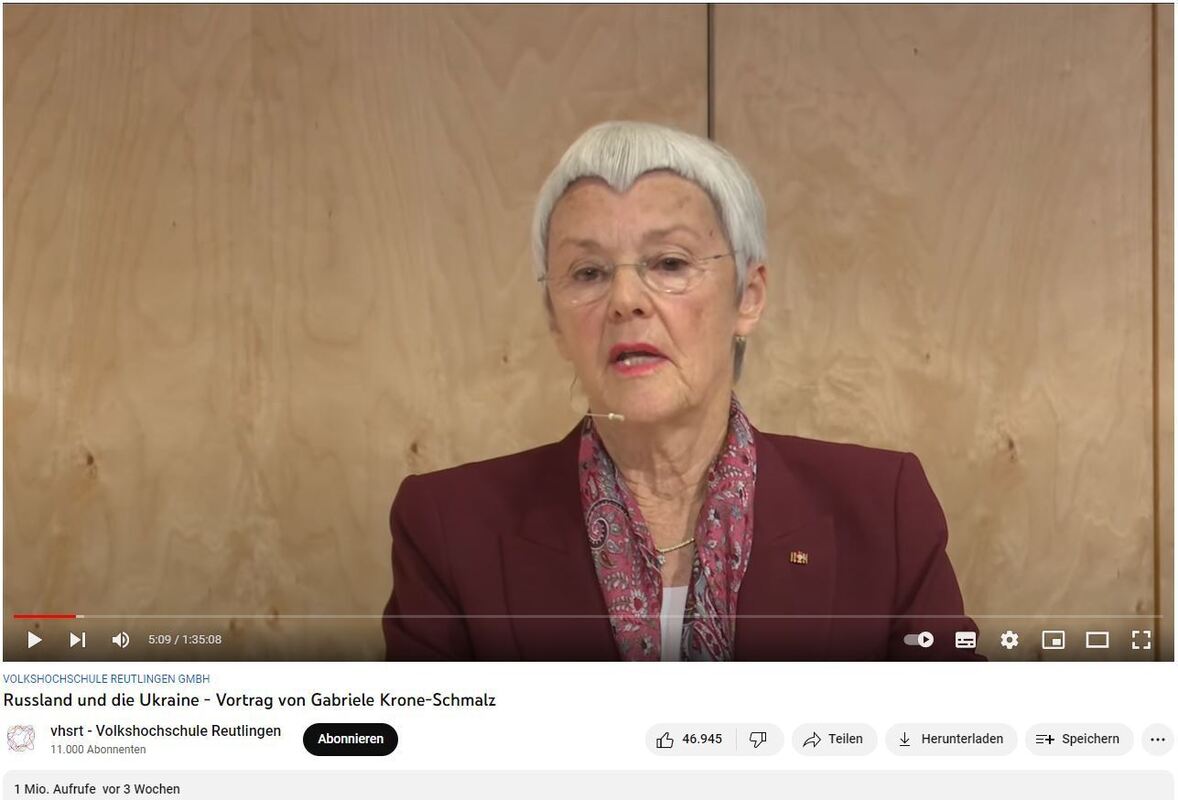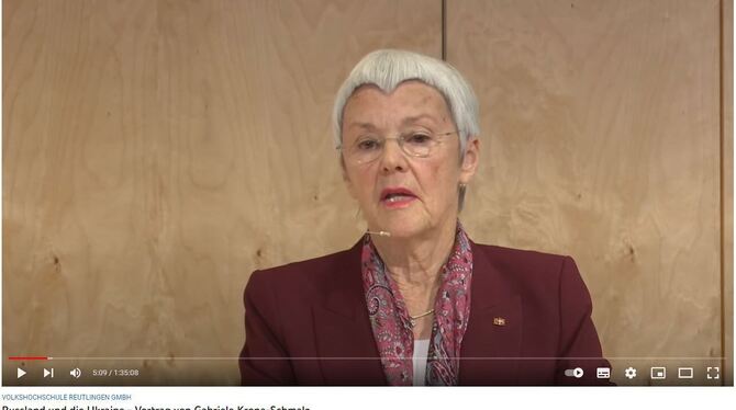 REUTLINGEN. Das Video eines Vortrags von Gabriele Krone-Schmalz (73) an der Volkshochschule (VHS) Reutlingen geht derzeit im Internet viral. Mehr als eine Million Aufrufe hat der Clip mit dem Titel »Russland und die Ukraine« in drei Wochen auf Youtube erreicht – es ist das mit Abstand erfolgreichste des VHS-Kanals. In dem Video wird die ehemalige ARD-Journalistin von VHS-Geschäftsführer Dr. Ulrich Bausch als Russland-Expertin und »sehr gefragte Referentin« vorgestellt: »Sie war über viele Jahre das Russland-Gesicht in der Fernsehberichterstattung.« Bausch freut sich »sehr, dass sie in Reutlingen ist«.