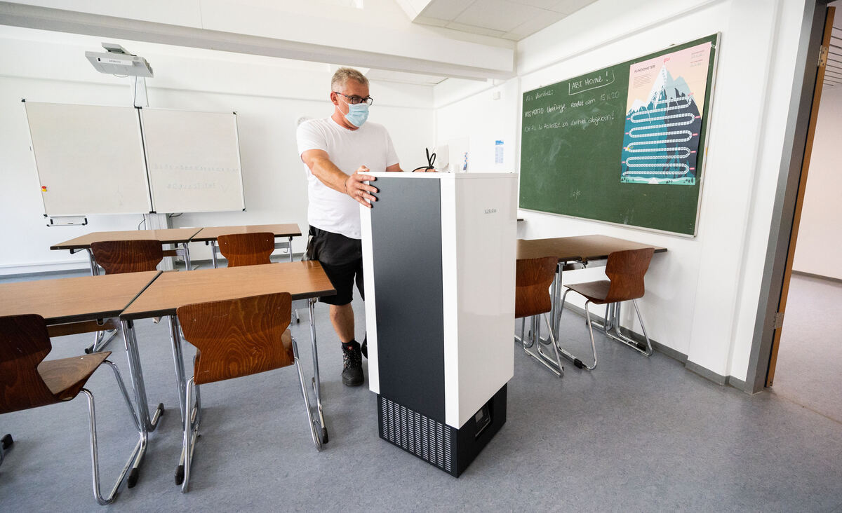 Ein Hausmeister schiebt einen Luftfilter ins Klassenzimmer.