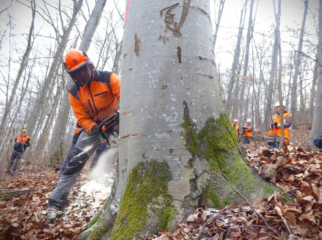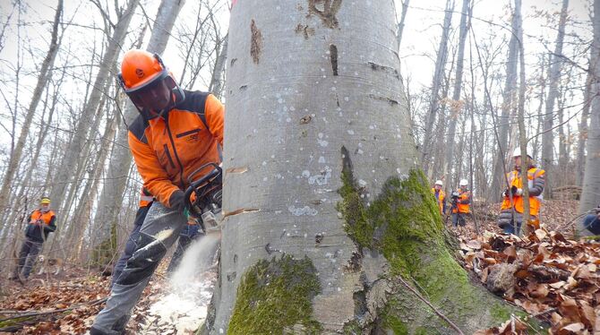 Die Forstleute rückten einer Rotbuche mit 68 Zentimeter Durchmesser zu Stamme.