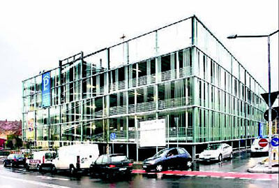 Zufahrt frei: Stadträtin Ursula Menton, Bürgermeister Peter Rist, Andreas Zwick (Regionalleiter des Parkhausbetreibers Apcoa) und Bauherr Willi Schöller zerschneiden das Band vorm Eingang zum Parkhaus Obere Wässere.