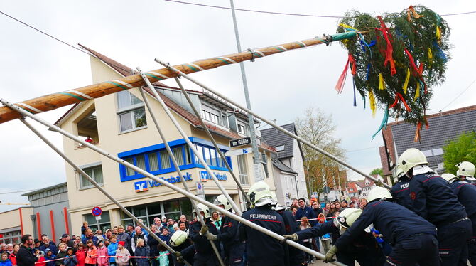17 Feuerwehrleute beförderten anschließend den Stamm in die Senkrechte, mithilfe von sogenannten »Schwalben«. Dabei handelt es sich um sechs Alustangen, von denen jeweils zwei mit kurzen Ketten miteinander verbunden sind. Kein leichtes Unterfangen für die Floriansjünger. »Allerdings hatte niemand Zweifel, dass das Maibaumstellen wie jedes Jahr auch diesmal wieder gelingen wird«, kommentierte Rupp das Geschehen. Erst nachdem der Maibaum senkrecht stand und gesichert war, wurden Kränze und die Wappen der Traditionsberufe sowie die Schilder der Betzinger Vereine mithilfe von dünnen Drahtseilen in die Höhe gezogen. Die Kränze sind laut Rupp »mit internationaler Hilfe« gefertigt worden. Eine ehemalige Betzingerin, die mittlerweile in Kanada lebt, hatte ebenso geholfen wie zwei ukrainische Frauen, die vor dem Krieg in ihrer Heimat geflüchtet sind. Gut gehen ließen es sich die Zuschauer anschließend bei der Bewirtung durch die Betzinger Feuerwehr. (nol)