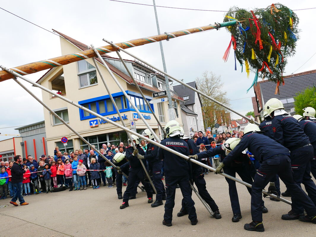 Mit einem Schlepper und Polizeibegleitung transportierten Aktive des Schwäbischen Albvereins den 17 Meter langen Stamm bis zu dem Platz, an dem – wie jedes Jahr üblich – der Maibaum mit einem ausgeklügelten System in die Höhe gewuchtet wurde. »Das geschieht rein mit Muskelkraft«, betonte Bezirksbürgermeister Friedemann Rupp.