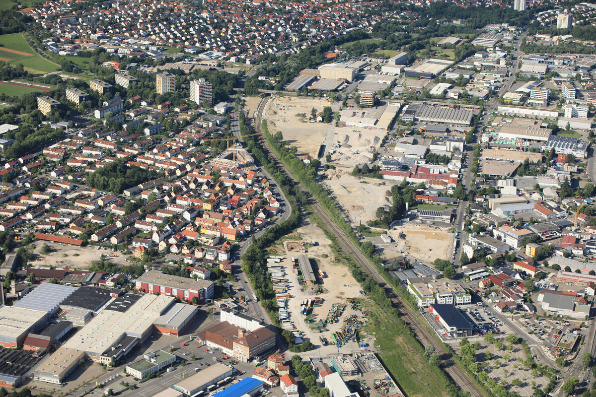 Gut zu sehen sind die Freiflächen für RT-unlimited rechts neben der Bahnlinie und oben, begrenzt durch die Siemensstraße, auf dem ehemaligen Betz-Gelände.