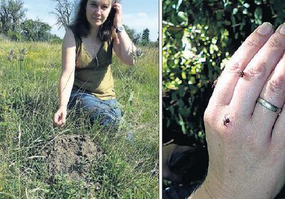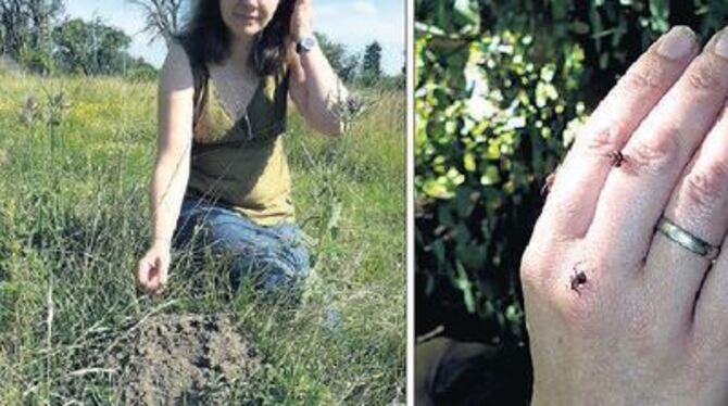 Ilona Schrimpf vom Umweltzentrum Listhof zeigt, wie Wohnburgen (links) von Ameisen ausschauen können, wenn sie nicht mit dem Rasenmäher plattgemacht werden. Auch für die roten Waldameisen ist der Listhof ein Paradies. Dabei sind die Biester ganz schön bissig: Kommt man ihren Bauten mit der Hand zu nahe, knabbern sie schwupp-di-wupp sich in die Haut.