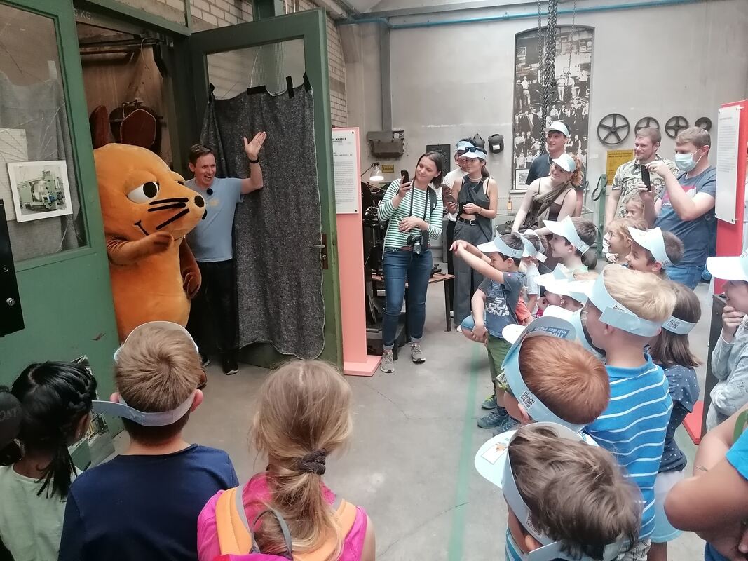 Großer Bahnhof für die Maus und WDR-Moderator Johannes Büchs gestern im Industrie-museum. FOTO: JENATSCHKE