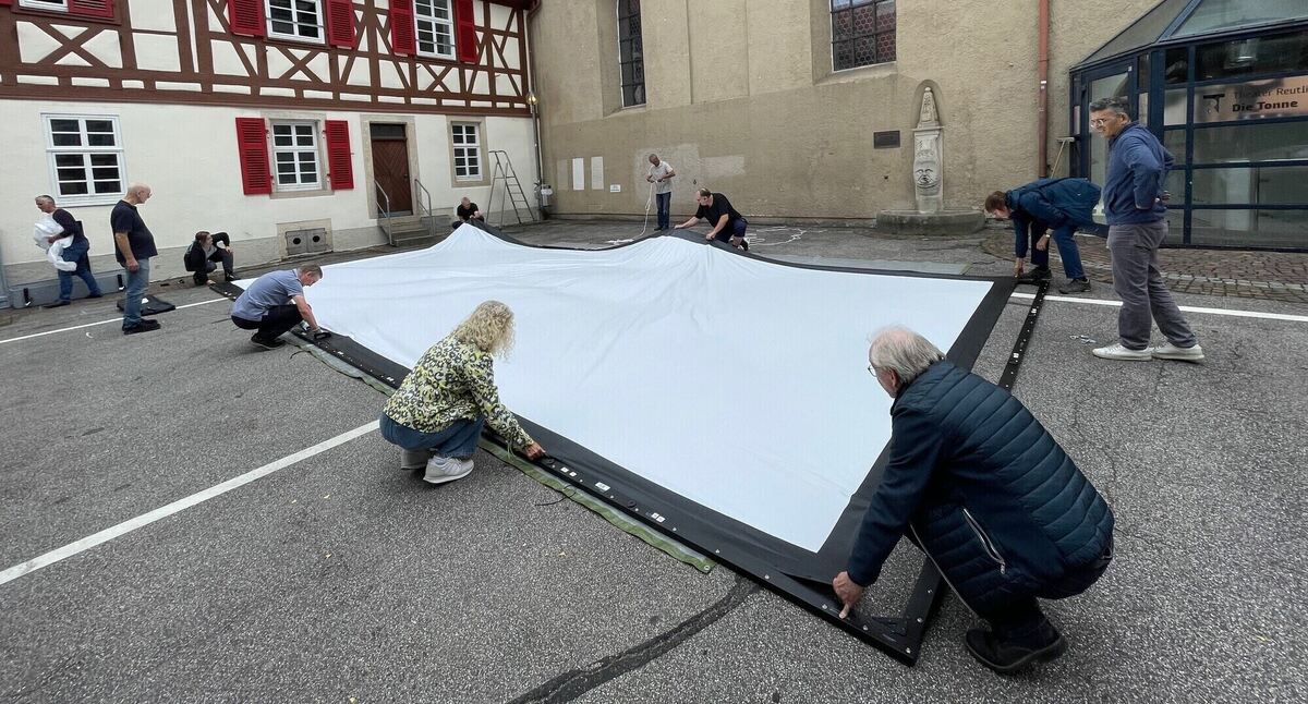 Helfer bauen am Montag im Reutlinger Spitalhof die Großleinwand ab.