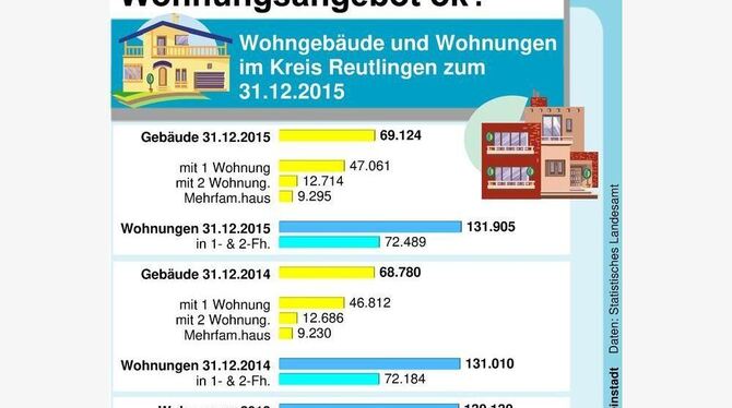 REUTLINGEN. Der Wohnungsmarkt ist in Schieflage geraten: In den Städten fehlt Wohnraum, auf dem Land gibt's zu viel. Wie entwickelt sich die Situation eigentlich im Kreis Reutlingen? Zum Jahreswechsel 2015/2016 gab es hier laut Fortschreibung der amtlichen Statistik insgesamt 131 905 Einheiten jeder Art und Größe. Zuletzt erhöhte sich der hiesige Bestand um 895 Wohnungen oder 0,7 Prozent. Vier Jahre zuvor (2011) hatte die Zahl noch bei insgesamt 128 675 Wohnungen gelegen.