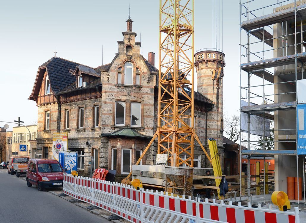 Die »Uhlandhöhe« mit ihrem Türmchen, rechts daneben der Neubau der Firma Held: Der neue Eigentümer, die Firma Akabus, will bei der Sanierung des denkmalgeschützten Baus mehr Wohnungen schaffen, als ursprünglich einmal geplant war. FOTO: TRINKHAUS