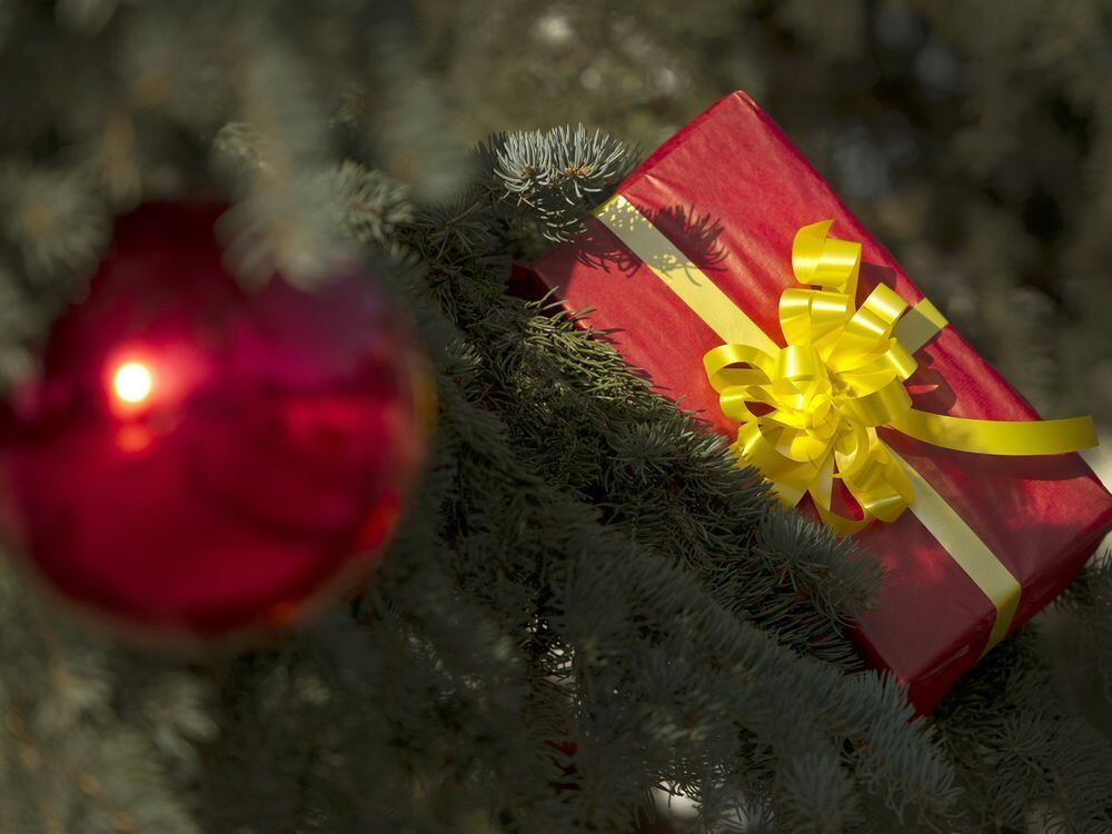Ein Weihnachtspäckchen umgeben von Tannengrün mit einer Weihnachtskugel.