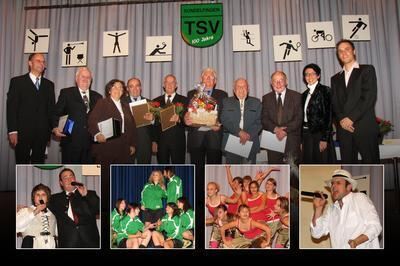Sie freuten sich über das unterhaltsame Programm: TSV-Vorsitzender Wolfgang Schmitt und die langjährigen Vereinsmitglieder Jörg Hack, Martha Schick, Philipp Mayer, Kurt Rehm, Rolf Thumm, Walter Lutz und Kurt Reinhardt (hinten von links). Ganz rechts die beiden stellvertretenden Vorsitzenden Marion Wörner und Martin Gerster.