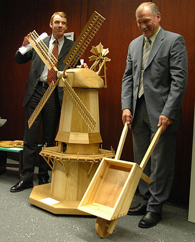 Gruppenbild mit prämierten Gesellenstücken: Siegfried Reiff (am Schubkarren) und Harald Herrmann.