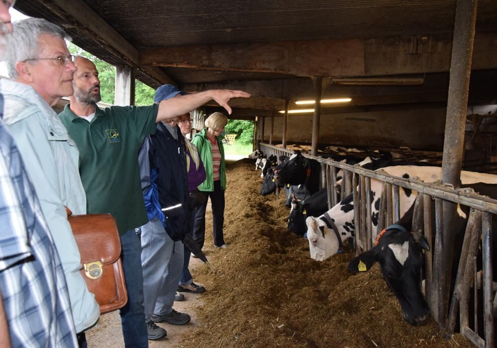 Information über schwarzbunte Kühe, die Tücken des Milchmarkts und Kälberaufzucht direkt vom Fachmann. Olaf Pank, im grünen Hemd, erklärt, warum die Kühe enthornt werden müssen, warum ein Bulle mitläuft und was im Futter ist. GEA-FOTO: GEIGER