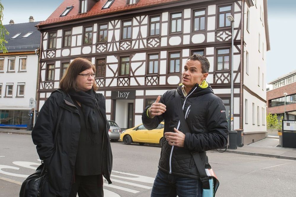 Für die Denkmalschützer Simone Wolfrum und Markus Ruopp ist die Sanierung des Gebäudes Albstraße 20 ein Beispiel für die gute Zusammenarbeit von Investoren und Behörden. FOTO: TRINKHAUS