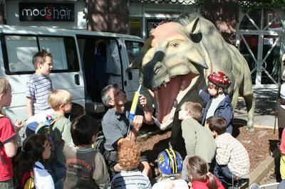 Auf den Zahn gefühlt: Während Peter Grüner die Plastik-Hauer des Entelodons am Burgplatz flickt, wird er von Kindern mit Fragen nicht nur über die Gebisse der Urzeit-Riesen gelöchert.