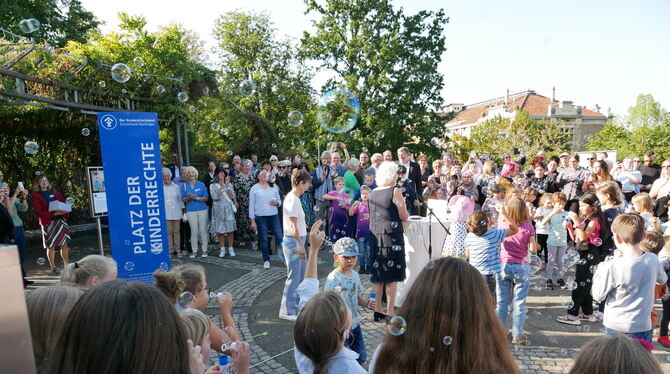 REUTLINGEN. »Wäre unsere Welt perfekt, dann würden wir heute nicht an diesem Ort zusammenkommen«, sagte Reutlingens Oberbürgermeister Thomas Keck am Freitagnachmittag am Platz an der oberen Brücke der Pomologie. Weil die Welt aber nun mal alles andere als perfekt ist, hat der Reutlinger Kinderschutzbund diesen Ort – der sich wie kaum ein anderer dafür eignet – zum »Platz der Kinderrechte« erklärt.