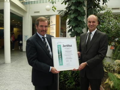 Professor Michael Bamberg, Präsident der Deutschen Krebsgesellschaft (links), überreichte Professor Thomas Zimmermann, Leiter des Reutlinger Darmzentrums, die Zertifizierungsurkunde.