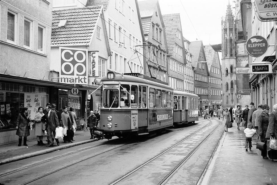 Ausweichstellen, wie hier auf der Wilhelmstraße bei der Marienkirche, ermöglichten den Begegnungsverkehr auf einspurigen Strecken.