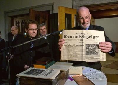 Dekan Jürgen Mohr mit einer GEA-Ausgabe aus dem Jahr 1954, dem Datum der ersten Grundsteinlegung des Matthäus-Alber-Hauses. Künftig gehört zu den ergänzten Zeitdokumenten auch ein GEA-Exemplar aus dem Jahr 2008.