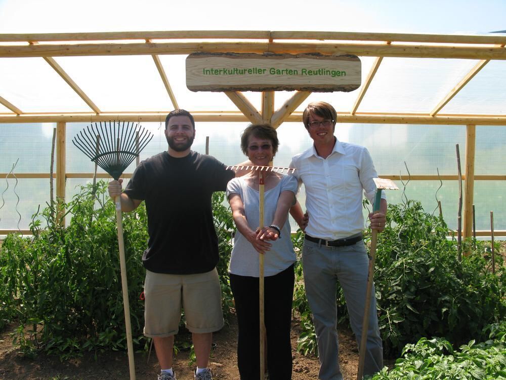 Dominik Adam, Mira Neumann und Vinzenz Fundel (von links) vor dem selbst gebauten Tomatenhaus.