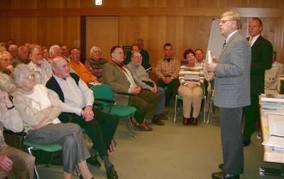 Hans Schlichting begrüßte zum Vortrag des neuen Urologie-Chefs Dr. Hartwig Schwaibold (im Hintergrund) achtzig Interessierte beim monatlichen Treffen der von ihm geleiteten Selbsthilfegruppe Prostatakrebs.
