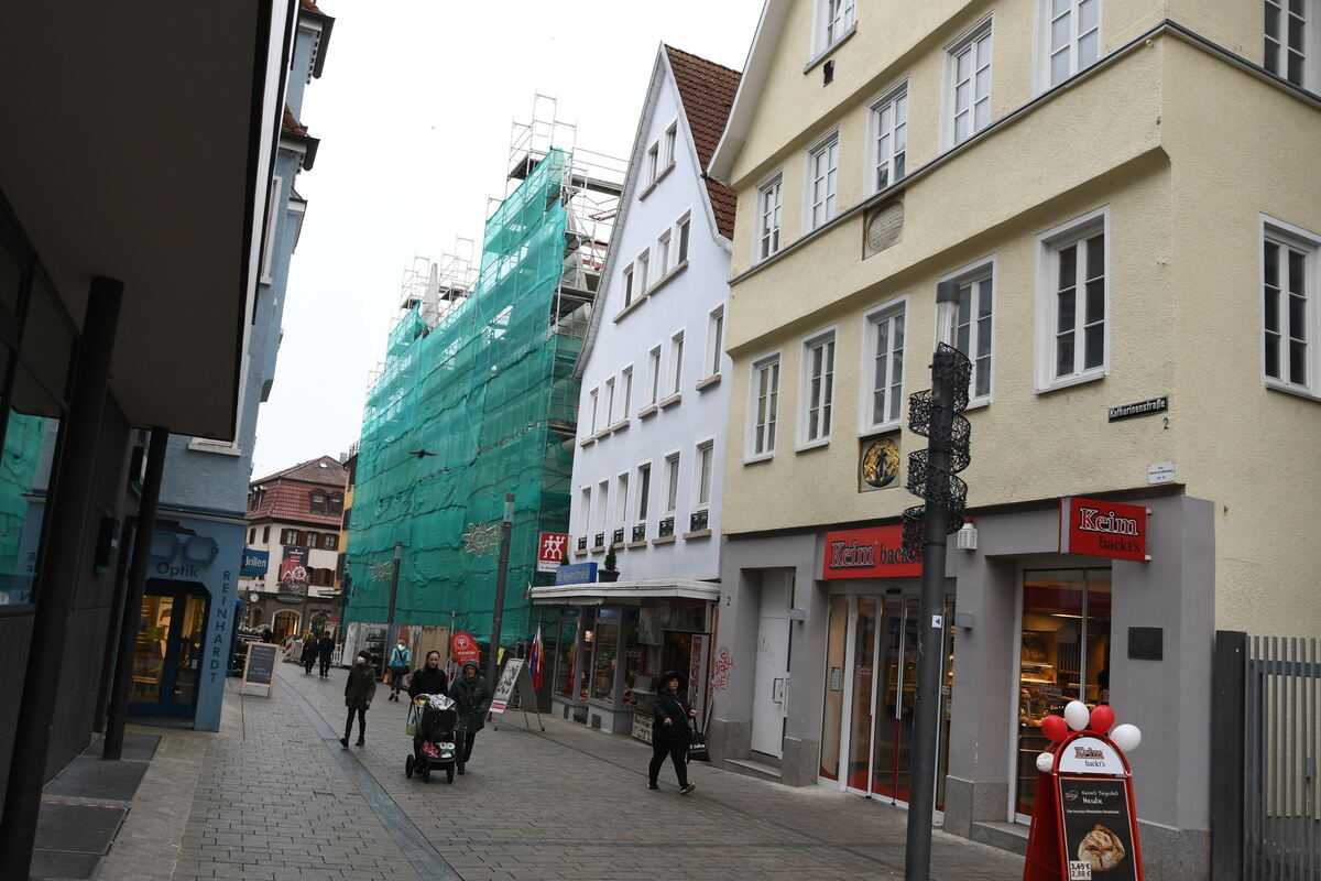Hinter den grünen Netzen an den Gerüsten verbirgt sich die Baustelle des Katharinenhofs.