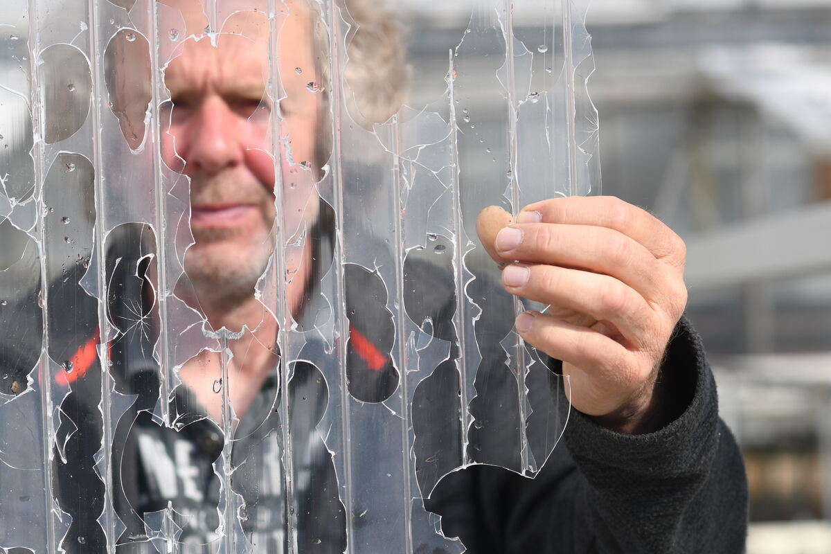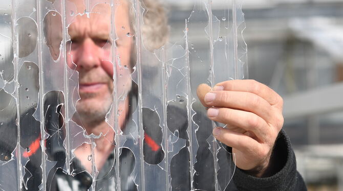 Bernhard Baum zeigt in seiner Gärtnerei in Degerschlacht vom Hagel durchschlagene Plexiglasplatten seiner Gewächshäuser. FOTOS: ZENKE