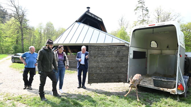 Neben Jagdpächter Bögle und Kollegen auch Oberbürgermeister Thomas Keck, der sich erstaunt erzählen lässt, der flüchtende Vierbeiner habe ja auch mal kurz im Rathaus vorbeigeschaut. Keck öffnet die Tür des Anhängers, der Bock traut dem Frieden zunächst nicht. Dann rennt er blitzschnell in den Forst. (GEA)